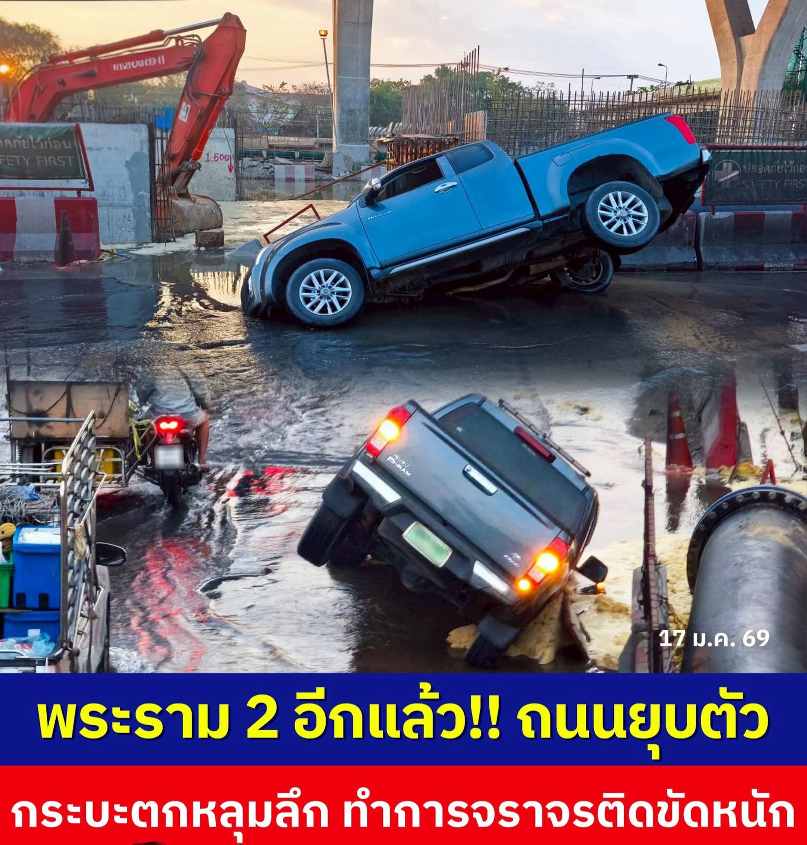 ถนนพระราม 2 อีกแล้ว ถนนยุบตัว กระบะตกหลุมลึกทับท่อประปาแตก ทำรถติดหนัก
