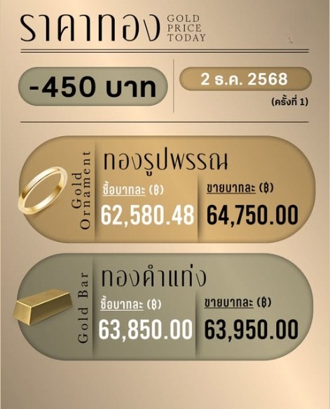 ราคาทองวันนี้ 2 ธันวาคม 2568 ล่าสุด ปรับลด 450 บาท ราคาทองรูปพรรณ บาทละ 64,750 บาท